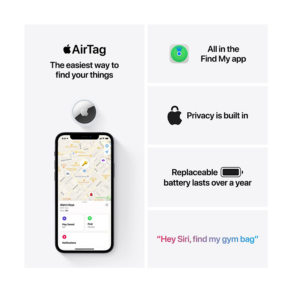 با داشتن ردیاب هوشمند ایرتگ اپل دیگر نگران گمشدن وسایل خود نباشید. این ردیاب جمعوجور دیسک شکل را میتوانید در کیف پول یا کیس تبلت خود قرار داده و یا میتوانید از جاسوئیچی این ردیاب برای وصل کردن کلیدهایتان و آویزان کردن ردیاب به بند کیف استفاده کنید. هرجایی که ردیاب AirTag باشد، میتوانید توسط برنامه Find My و اسپیکر داخلی ایرتگ آن را پیدا کرده و همچنین میتوانید از Siri بپرسید که وسیلهتان کجاست و آن را پیدا کنید. نوتیفیکیشنهای این وسیله بر روی اپل واچ نیز قابل مشاهده است و اگر آیفون 11 و یا 12 دارید، میتوانید از قابلیت Precision Finding این ردیاب برای تشخیص جهت و فاصله دقیق آن استفاده کنید. اگر وسیله دارای ردیابتان کاملاً گم شده و فاصله شما تا آن وسیله زیاد است، میتوانید از طریق Find My network آن را پیدا کنید.